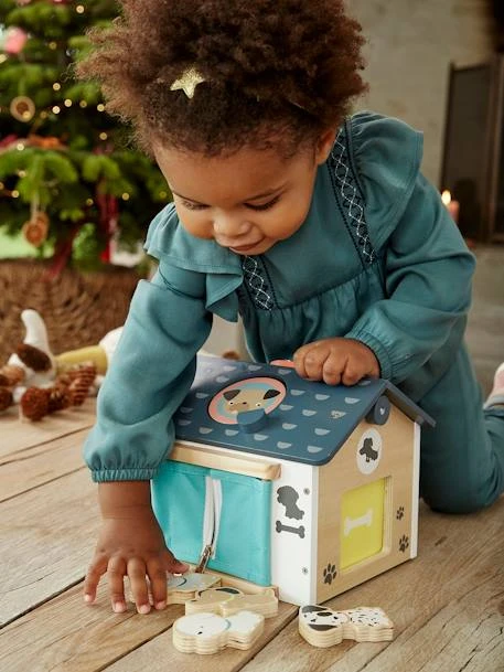 Une niche avec 6 ouvertures que l’enfant devra ouvrir pour ensuite y insérer un petit chien. Chaque ouverture propose un système différent : ouverture à pousser, à tirer, à boutonner, à clé… de quoi développer leur motricité fine en s’amusant !