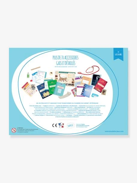 - Plus de 50 accessoires miniatures : stéthoscope (qui fonctionne réellement), plaque professionnelle, dossiers médicaux à personnaliser avec les photos d’animaux fournis, bloc d’ordonnances, vignettes vaccins à coller sur les carnets de santé, radios et analyses, bandages pour les pattes blessées, seringue pour vacciner les nounours, abaisse-langue, livre de rendez-vous…
